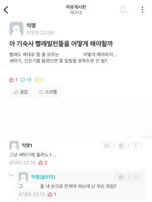 학생생활관 세탁기 안에 방치되는 세탁물로 인해 학생들의 불만이 속출하고 있다.지난 11월 30일 대학생 커뮤니티 ‘에브리타임’에서 익명의 학생이 “3~4시간 동안 방치해두면 다른 사람들은 세탁기 어떻게 쓰냐”며 “빨래를 했으면 좀 가져가라”라고 세탁실에 방치되는 세탁물에 대한 불만을 드러냈다.이러한 불만은 11월 30일뿐만 아니라 이전부터 지속됐다. 지난 7월 5일에도 익명의 학생이 “세탁기, 건조기를 돌렸으면 좀 알람을 맞추면 안 됨?”이라며 세탁물을 방치하는 학생에 불만을 표출했다.학생생활관 세탁실은 거주 학생이 공용으로 사용할