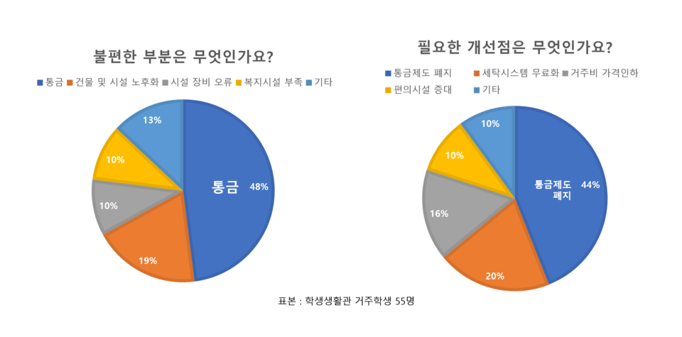설문조사 결과, 학생들이 거주하는 호관에서 느끼는 불편한 부분의 1위로 48%가 '통금'을 꼽았다. 거주하는 호관에 필요한 개선점에 대한 추가적인 질문에도 44%가 '통금제도 폐지'를 택하며 앞도적인 지지를 보였다. 5호관에 거주하는 윤씨(독일학과 2학년)는 "성인인 대학생들에게 통금이 있는 이유를 모르겠다"며 "통금이 없어진다고 해서 문제가 될 것 같지는 않다"고 불편함을 토로했다.