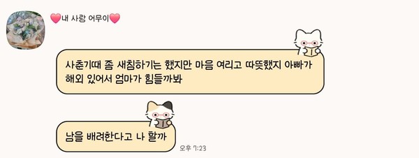 하지만 이는 내 오산이라는 것을 깨닫게 되었다. 부모님께 나의 사춘기 시절을 물었을 때 ‘좀 새침하기는 했지만 마음 여리고 따뜻했지.’, ‘아빠가 해외에 있어서 엄마가 힘들까 봐, 남을 배려한다고나 할까.’, ‘외국 나가 있어 말로 힘내라고밖에 할 수 없어서 미안했어.’, ‘잘 지내줘서 대견스럽고 고마웠어.’라고 대답해 주셨다. 외에도 오갔던 대화를 통해 덮어만 두고 꺼낼 생각조차 하지 않았던 사춘기 시절의 상처를 마주할 수 있었다. 이제는 나의 사춘기에게 괜찮다고 말을 건넬 수 있을 것 같다.